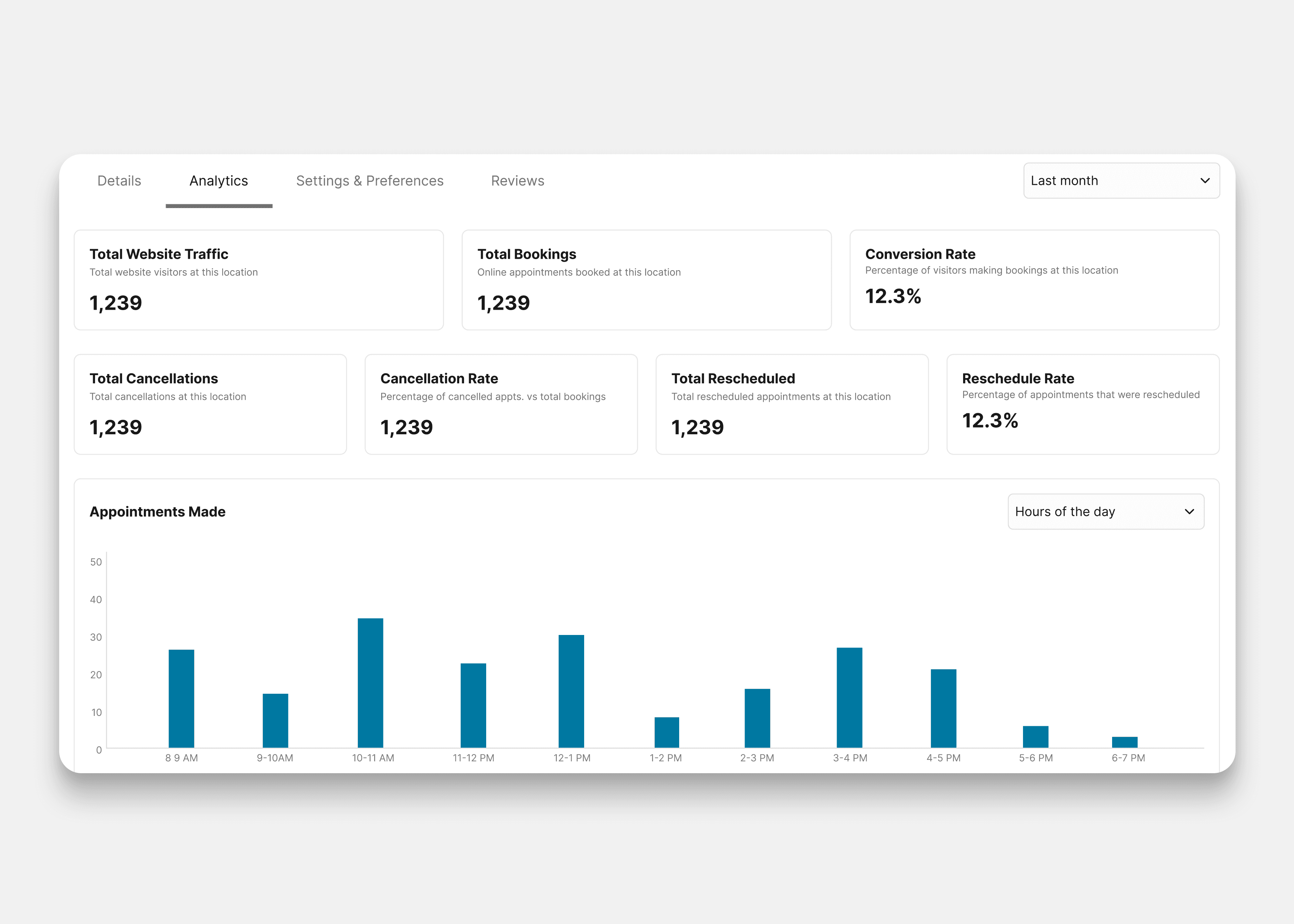 Track appointment trends, client retention, no-show rates, booking sources, and more. Use real data to optimize your hours, marketing, and services.